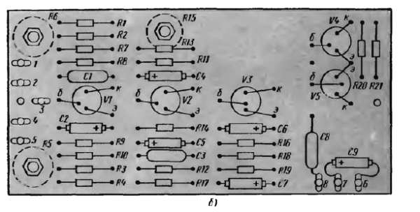 Приемник монтируй на гетинаксовой или текстолитовой плате толщиной 2–2,5 мм. Чертеж платы с разметкой отверстий на ней приведен на рис. 346, а.