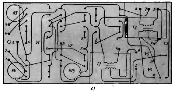 Размещая детали на плате и соединяя их, придерживайся схем, показанных на рис. 346, б и в. Соединения деталей делай медным проводом диаметром 0,4–0,5 мм в поливинилхлоридной изоляции.