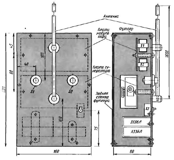 Эту панель вырежь из листового алюминия толщиной 1,5–1,8 мм. Отверстия в панели сверли с учетом размеров деталей. Если у тебя не окажется подходящих кнопок, замени их тумблерами. Плату задающего генератора с усилителем мощности и плату модулятора крепи к панели на трубчатых стойках длиной 30–35 мм, а батарею питания (три батареи 3336Л) с помощью жестяных хомутов.