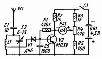 Прибор представляет собой детекторный приемник, на выход которого можно подключить индикатор настройки микроамперметр РА1 или головные телефоны В1. Шкалу прибора градуируют в частотах. Детектор V1 — любой точечный диод. Микроамперметр РА1 на ток 100–500 мкА.