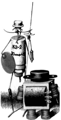 Микрофон — электромагнитный типа M1 (от слухового аппарата). Размещай его на амортизаторе, роль которого может выполнять пористая резина или поролон. Иначе от сотрясений модели могут быть ложные срабатывания приемника. Роль микрофона может также выполнять телефонный капсюль ДЭМ-4м или ТА-56М.