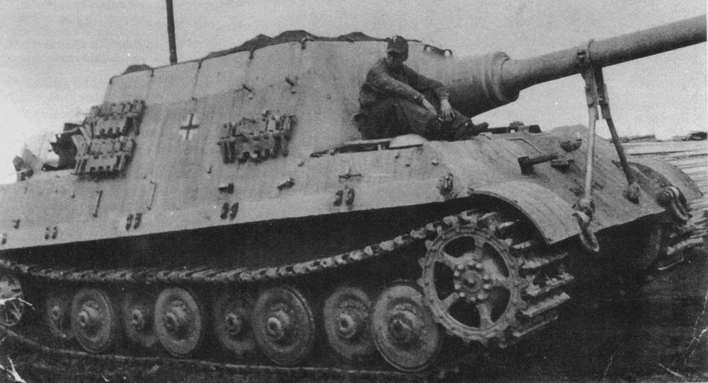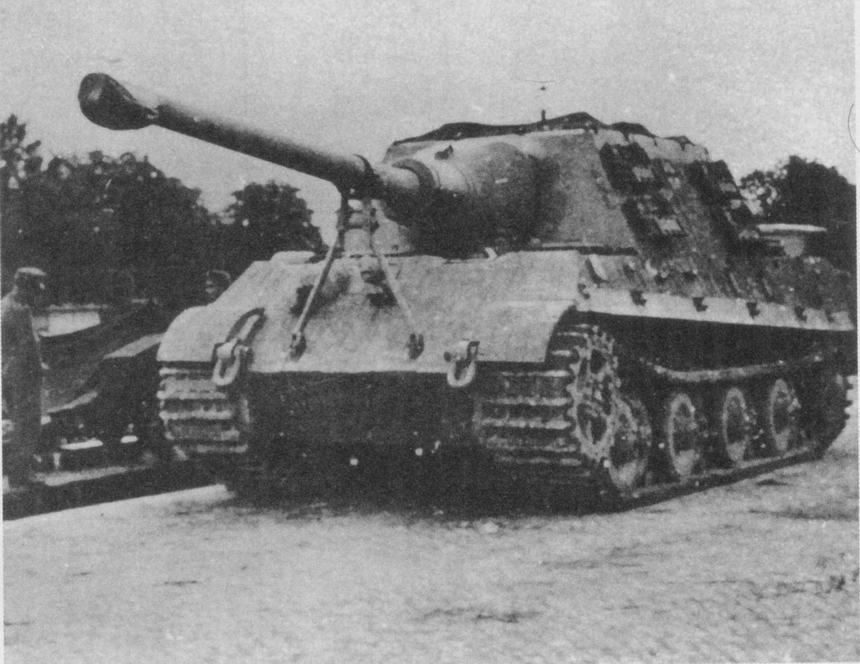 Фотография иллюстрирует процесс транспортировки «Ягдтигром» танка «Тигр II». Буксировка ведется по бездорожью, что опровергает мнение некоторых исследователей, считающих, что «Ягдтигр» с трудом мог передвигаться сам (и то лишь по хорошей дороге), но не тянуть себе подобных.