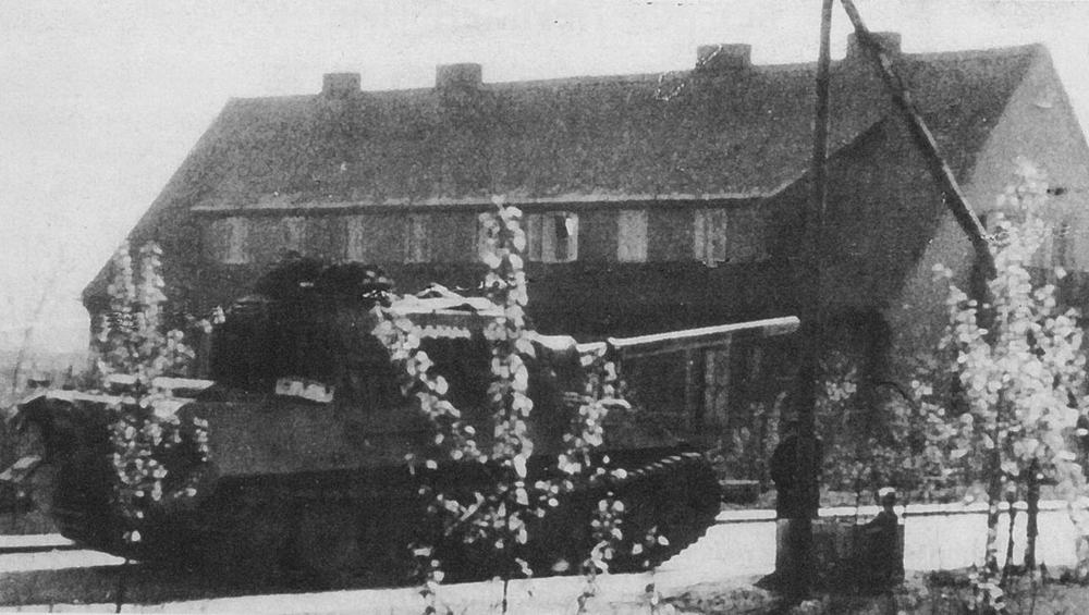 «Ягдтигр» движется по г. Сант-Валентин от завода-изготовителя к сборному пункту. Приведена машина, относящаяся скорее всего к 512 тяжелому истребительно-противотанковому батальнону.