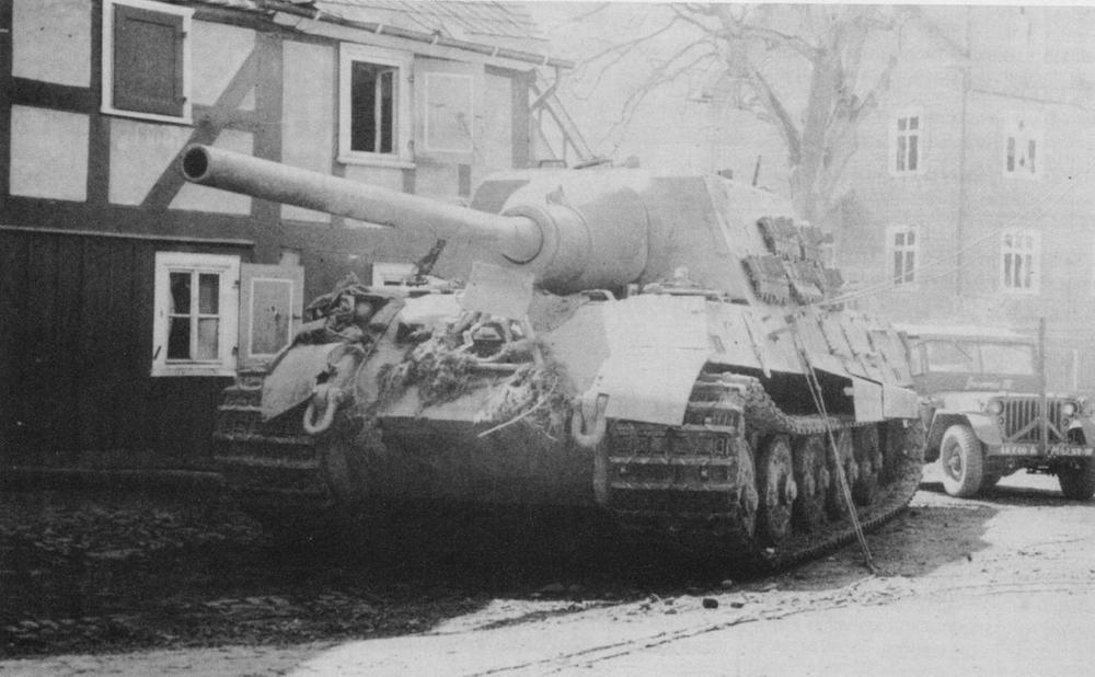 «Ягдтигр» (шасси № 305058), принадлежащий 512 тяжелому истребительно-противотанковому батальону, захваченный американскими войсками. Март 1945 г.
