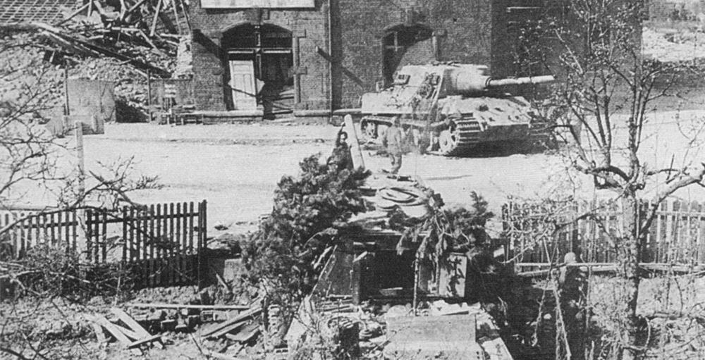 Два «Ягдтигра» 1-й роты 512 тяжелого истребительно-противотанкового батальона, брошенные при отступлении в г, Нойштадте.