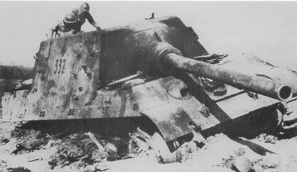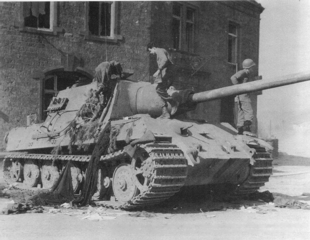 Американские солдаты рассматривают один из брошенных немцами при отступлении «Ягдтигров» в г. Нойштадте. Эта машина была отправлена на испытания в США.