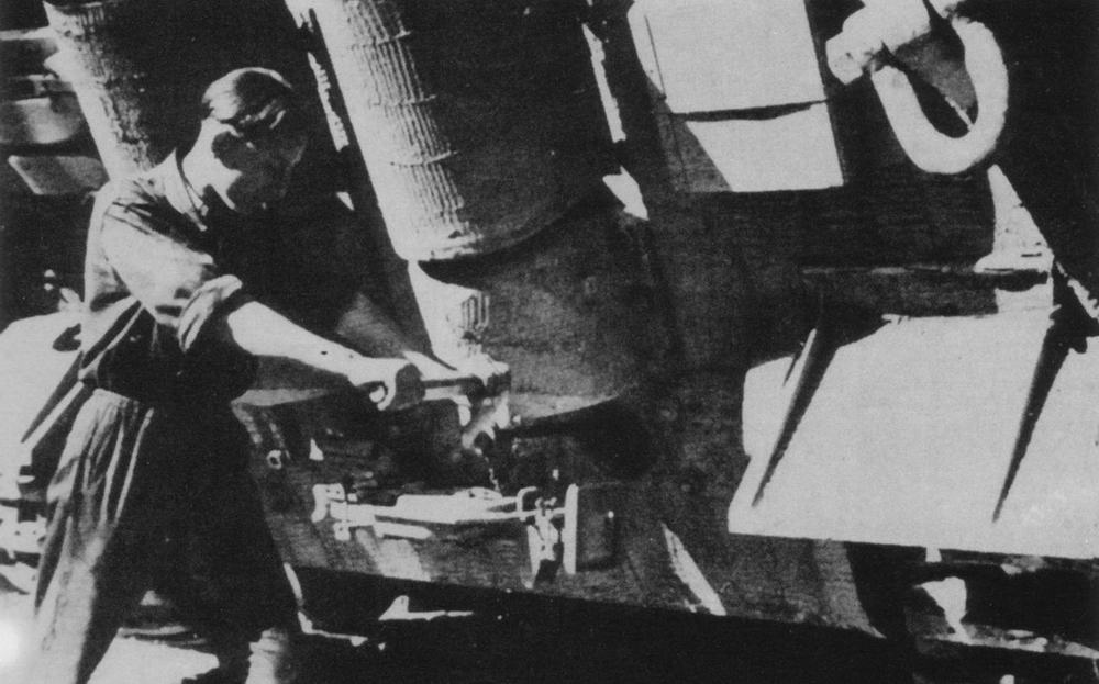 Прокручивание двигателя САУ «Ягдтигр» ручкой кикстартера. Завести машину таким способом было крайне тяжело, если не сказать больше. Это действо применялось чаще всего только для разгона загустевшей смазки.