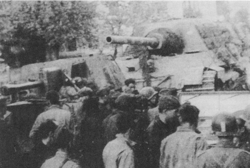 Встреча советских и американских солдат. Май 1945 г. Позади СУ-76 стоит брошеный «Ягдтигр». Видимо эта машина принадлежала 653 тяжелому истребительнопротивотанковому батальону и сегодня хранится в Музее бронетанкового вооружения и техники в г. Кубинка Московской обл.