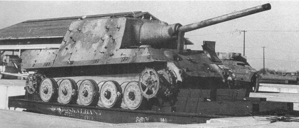 «Ягдтигр» № 331, захваченный американскими войсками, подготовлен для отправки в Абердин. Сегодня экспонируется в Абердинской бронетанковой коллекции. Хорошо видны особенности оригинального камуфляжа, не соответствующего сегодняшнему.