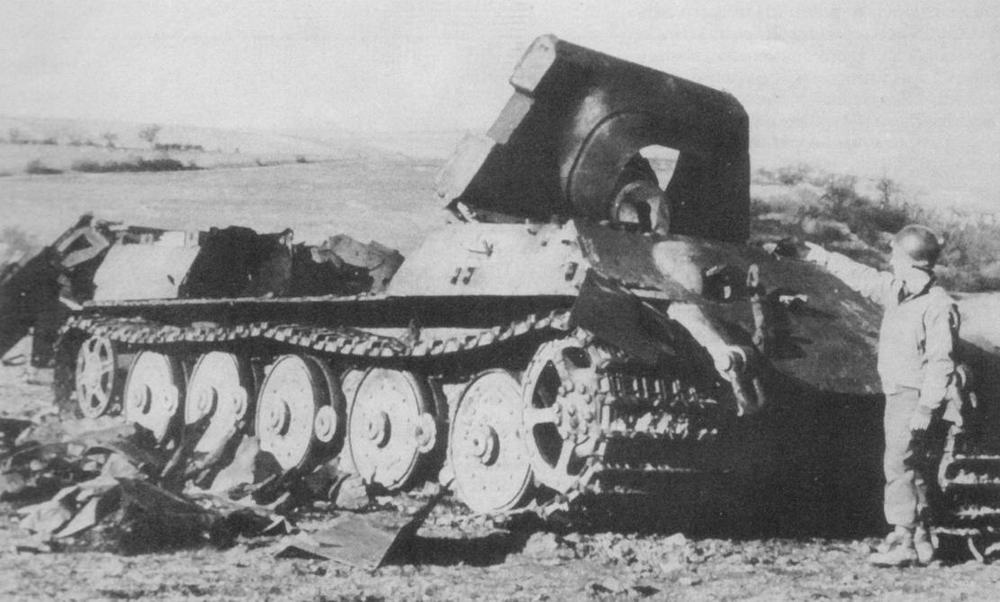 Та же машина после схода с ж.д. платформы. Слева от машины видны солдаты, сгружающие фальшборта. Идет подготовка к «переобуванию» машины. Сентябрь 1944 г.