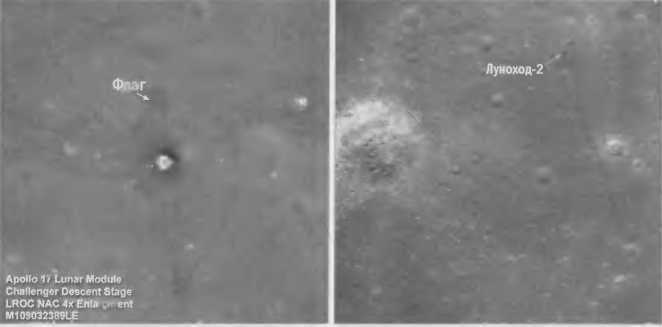 Впрочем, все это события далекого будущего и далекого прошлого, а наш нынешний интерес к Луне в значительной мере вызван современными проблемами. Сегодня она представляется источником полезных ископаемых, космическим портом для экспедиций к далеким планетам, научной базой, военным полигоном, инструментом политической борьбы… Первые лунные экспедиции — самая романтическая страница в истории космонавтики. Полеты человека на Луну стали в полном смысле слова легендой, которую многие теперь стали воспринимать как фантазию, а некоторые — как мистификацию. Кто бы мог подумать 40 лет назад, что в XXI веке придется доказывать реальность лунных экспедиций и искать их следы на поверхности Луны (рис. 8.9)?
