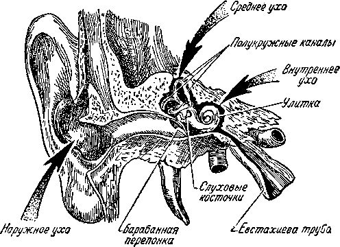 Слуховой орган — ухо — представляет собой сложное сооружение. То, что в быту называют «ухо» — всего лишь ушная раковина.