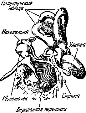 Если углубиться внутрь ушной раковины, то обнаружится слуховой проход, закрытый круглой перепонкой, которая называется барабанной. Она похожа на конус, вершина которого втянута внутрь среднего уха. Со стороны среднего уха к середине барабанной перепонки прикреплена косточка в форме молоточка, которая другим концом сочленена с другой косточкой — наковальней. Наковальня соединена с третьей косточкой — стременем; второй конец стремени упирается в перепонку, отделяющую среднее ухо от внутреннего.