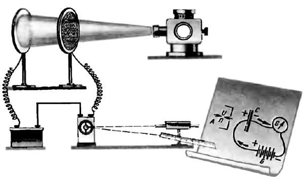 Неподалеку друг от друга он расположил металлический диск и тонкую металлическую сетку, укрепив их на стеклянных стойках. Диск соединил с отрицательным, а сетку — с положительным полюсами батареи. Между сеткой и батареей он включил чувствительный электроизмерительный прибор — гальванометр с зеркальцем на подвижной рамке вместо стрелки. Против гальванометра находился фонарик, а под ним полоса бумаги с делениями — шкала. Пучок света от фонаря направлялся на зеркальце гальванометра, а отраженный от него зайчик падал на шкалу. Даже при незначительном токе зеркальце гальванометра поворачивалось, заставляя световой зайчик бежать по делениям шкалы. На некотором расстоянии от диска и сетки А. Г. Столетов установил другой фонарь, свет которого, пронизывая сетку, освещал диск. Пока шторка дугового фонаря была закрыта, световой зайчик покоился на нуле шкалы. Но стоило шторку приоткрыть, как зайчик тотчас начинал перемещаться по шкале, указывая на наличие тока в, казалось бы, разорванной цепи.