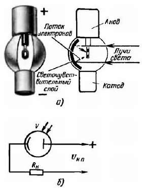 Рис. 245. Газонаполненный фотоэлемент ЦГ-3 (а) и его включение в электрическую цепь (б)