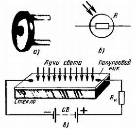 Рис. 246. Внешний вид (а), схематическое обозначение (б), устройство и включение (в) фоторезистора