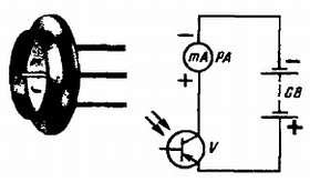 Если в коллекторную цепь включить миллиамперметр, он при сильном освещении кристалла транзистора покажет возрастающий до нескольких миллиампер коллекторный ток. Это свойство транзисторов, аналогичное свойствам фотоэлементов с внутренним фотоэффектом, широко используется радиолюбителями-экспериментаторами в самодельных приборах-автоматах.