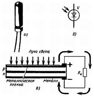 Рис. 247. Внешний вид (а), обозначение на схемах (б), устройство и схема включения (в) фотодиода