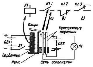 В зависимости от назначения электромагнитные реле имеют разные конструкции корпусов и якорей, пружинных контактов, различные данные обмоток. Но принцип работы всех реле одинаков: при некотором значении тока, протекающего через обмотку, реле срабатывает и его якорь, притягиваясь к намагниченному сердечнику, замыкает или размыкает контакты исполнительной цепи.