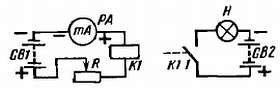 При замыкании контактов К1.1 лампа Н загорается, а при размыкании гаснет. Изменяя сопротивление цепи резистором R и следя за показаниями миллиамперметра, легко определить токи, соответствующие моментам срабатывания и отпускания реле. Эти сведения облегчат и ускорят работы по налаживанию приборов-автоматов.
