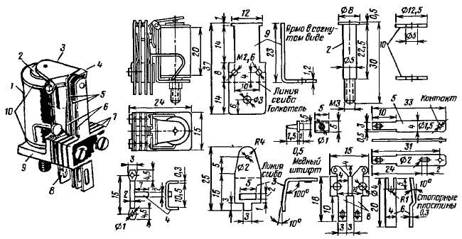 Якорь реле также делай из мягкой листовой стали толщиной 1,2–1,5 мм. Чтобы предотвратить залипание якоря из-за остаточного магнетизма сердечника, в верхней части его якоря, согласно чертежу, просверли отверстие диаметром 1 мм и вклепай в него медный штифт. Высота штифта со стороны сердечника должна быть 0,1–0,2 мм. К нижней части якоря клеем БФ-2 приклей толкатель, сделанный из органического стекла.