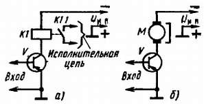 Схема простейшего электронного реле показана на рис. 253, а. Это обычный однотранзисторный усилитель тока, работающий в режиме переключения, на выход которого включено электромагнитное реле. В зависимости от структуры транзистора и полярности управляющего сигнала, поданного на вход усилителя, транзистор закрывается (для транзистора структуры р-n-р — при положительном напряжении на базе) либо, наоборот, открывается (при отрицательном напряжении на базе транзистора р-n-р). Когда транзистор закрыт, сопротивление его участка эмиттер-коллектор велико и ток коллектора не превышает 20–25 мкА, чего слишком мало для срабатывания реле. В это время контакты К1.1 реле К1 разомкнуты и исполнительная цепь не включена. Когда же транзистор открывается, сопротивление его участка эмиттер-коллектор резко уменьшается и ток коллектора возрастает до значения, необходимого для срабатывания реле — включается исполнительная цепь.