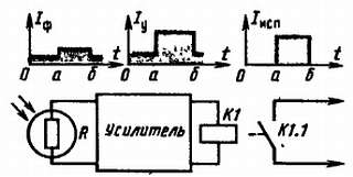 Допустим, что фоторезистор R (на его месте может быть любой другой фотоэлемент) затемнен, например закрыт рукой. В это время (на графиках — участки Оа) ток цепи фотоэлемента Iф и ток усилителя Iу малы, а ток в исполнительной цепи вообще отсутствует, так как контакты К1.1 реле К1 разомкнуты. Если теперь открыть фотоэлемент или направить на него пучок света, токи фотоэлемента и усилителя резко увеличатся (на графиках — участки аб), сработает электромагнитное реле и своими контактами включит цепь питания механизма исполнения. Но стоит снова затемнить фотоэлемент, как тут же разомкнется (или переключится) цепь исполнения.