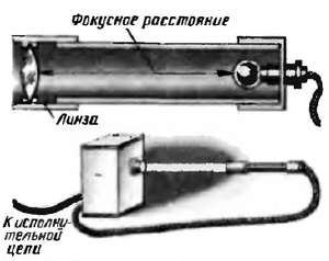 Четкость срабатывания любого из фотореле, о которых я здесь тебе рассказал, в значительной степени зависит от его осветителя. Наиболее эффективно фотореле будет работать, если осветитель дает узкий и яркий пучок света в направлении точно на фотоэлектронный датчик. Осветитель можно сделать в виде металлический или картонной трубки длиной 120–220 и диаметром 28–30 мм. Внутри трубки на одном конце укрепи малогабаритную лампу накаливания, рассчитанную на напряжение 9-12 В (например, автомобильную), а на другом собирательную линзу (например, круглое очковое стекло) с фокусным расстоянием 100–120 мм. Взаимное расположение линзы и лампы в осветителе подбери опытным путем так, чтобы свет выходил из осветителя узким пучком.