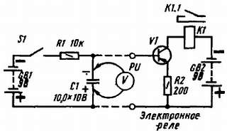 Что произойдет, если к обкладкам заряженного конденсатора подключить электронное реле на транзисторе с относительно большим входным сопротивлением? Увеличить входное сопротивление транзистора можно включением резистора R2 в цепь его эмиттера. Конденсатор станет разряжаться через эмиттерный переход и эмиттерный резистор R2 транзистора электронного реле. При этом транзистор откроется, реле К1 сработает и контактами К1.1 включит исполнительную цепь. Как только конденсатор разрядится, транзистор закроется, реле К1 отпустит и размыкающимися контактами разорвет исполнительную цепь. Время разрядки конденсатора, а значит, и время выдержки открытого состояния транзистора определяется емкостью конденсатора и сопротивлением цепи, через которую он разряжается. Таков принцип работы электронного реле выдержки времени.