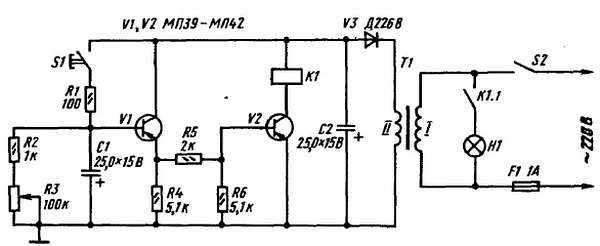 В автомате используются транзисторы серии МП26 (можно МП20, МП21, МП25 с любым буквенным индексом, МП40А), рассчитанные на более высокое, чем аналогичные им маломощные транзисторы, коллекторное напряжение. Реле K1 — типа РЭС-22 (паспорт РФ4.500.131), РСМ-1 (паспорт Ю.171.81.37) или другое с обмоткой сопротивлением. 650–750 Ом и нормально замкнутыми контактами.