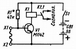 Это опять-таки знакомое тебе электронное реле на транзисторе V1, между базой и эмиттером которого (зажимы X1 и Х2) включен охранный шлейф. Этот шлейф, обозначенный на схеме волнистой линией, представляет собой медный провод диаметром 0,1–0,12 мм, например ПЭВ-1 0,1, протянутый вдоль границы охраняемого объекта. Его сопротивление небольшое — всего 1,5–2 Ом на погонный метр. Поэтому можно считать, что база транзистора соединена с эмиттером непосредственно. Следовательно, пока шлейф дал, транзистор закрыт. Но вот кто-то, может быть собака, желая попасть в охраняемый объект, оборвала шлейф. При этом на базе транзистора оказывается отрицательное напряжение (подаваемое через резистор R1), транзистор открывается, электромагнитное реле К1 срабатывает и его контакты К1.1, замыкаясь, включают сигнализацию — электрозвонок, сирену или просто электролампу, питающуюся от электросети.