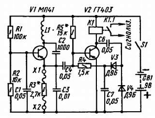 В таком сторожевом устройстве надо использовать транзисторы с коэффициентом h21Э не менее 50, причем транзистор ГТ403 можно заменить любым другим транзистором средней мощности структуры р-n-р, например ГТ402, П201, П601. Электромагнитное реле К1 — с обмоткой сопротивлением 200–250 Ом, например РСМ-1 (паспорт Ю.171.81.43) или аналогичное другое, срабатывающее при напряжении не более 9 В. Дроссель L1 самодельный. Он состоит из 650–700 витков провода ПЭВ-1 0,1, намотанных на каркасе диаметром 10–12 мм между щечками, приклеенными к каркасу на расстоянии 20 мм одна от другой.