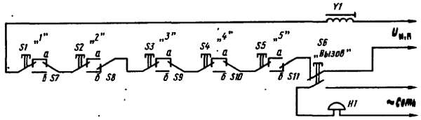 Схема наиболее простого электромеханического кодового замка показана на рис. 263: Y1 — электромагнит, S1-S6 — кнопочные переключатели, S7-S11 — тумблеры. Пульт кнопок, с помощью которых можно отвести защелку замка, находится с наружной, а тумблеры S7-S11 кодирования замка — с внутренней стороны двери. Чтобы электромагнит сработал и таким образом позволил открыть дверь, надо знать код замка и с учетом этого шифра одновременно нажать соответствующие ему кнопки.