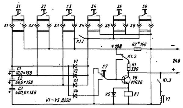 Схема такого кодового замка показана на рис. 264. Он состоит из трех электролитических конденсаторов С1-С3 разной емкости, являющихся «памятью» замка, четырех диодов V1-V4, транзистора V6 с электромагнитным реле К1 в эмиттерной цепи, семи кнопок SI — S7, шесть из которых входят в пульт управления замком, и электромагнита Y1, сердечник которого механически связан с защелкой дверного замка. Штепсельные разъемы X1-Х6 образуют кодировочный узел замка.