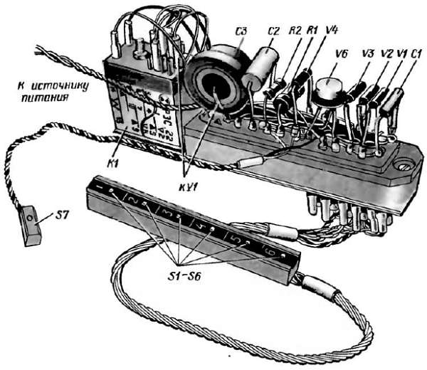 Все детали, кроме кнопок, смонтированы на гнездовой части штепсельного разъема, являющейся одновременно и кодировочной колодкой замка. Штепсельная часть этого разъема распилена поперек на части, образующие двухполюсные штепсельные вилки разъемов Х1-Х6.