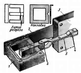 Пакет Ш-образных пластин распилен по штриховым линиям. Его средняя часть используется как якорь 6, а боковые части и набор замыкающих пластин в качестве магнитопровода 1 тягового электромагнита. Части магнитопровода скреплены вместе с помощью металлических накладок и заклепок. Чтобы внутри каркаса с обмоткой, находящейся в магнитопроводе, якорь мог перемещаться без заметного трения, в его наборе на 4–5 пластин меньше, чем в наборе магнитопровода. Якорь электромагнита соединяют с ручкой защелки 4 дверного замка 3 тягой 5 из двух склепанных вместе полосок листовой стали толщиной 0,5–1 мм. Магнитопровод вместе с обмоткой крепят на стальной пластине 2 толщиной 2–2,5 мм, которую подкладывают под дверной замок и вместе с ним укрепляют на двери. Такой электромагнит при включении потребляет ток около 1 А. На такой ток должны быть рассчитаны и диоды выпрямителя, питающего этот вариант кодового замка.