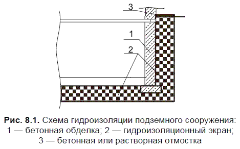 Для создания противодавления внутри гидрозащитного экрана при фильтрации воды к обделке подземной части сооружения сверху устраивается бетонная или растворная отмостка (рис. 8.1).