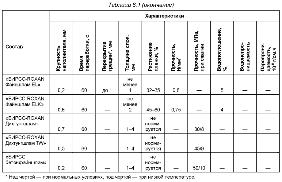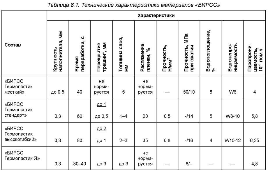 Актибенто-песчаная смесь «БИРСС-36» в отличие от смеси «БИРСС-35», которая применяется исключительно в сухом виде, предназначена для приготовления изоляционной пасты, которая используется в прмышленном и гражданском строительстве, гидротехническом строительстве, горном деле. Изоляционная актибенто-песчаная паста представляет собой предварительно затворенную и тщательно перемешанную сухую смесь при водотвердом отношении 1,75:1. При затворении водой паста приобретает и сохраняет устойчивые пластические свойства, что обеспечивает возможность ее транспортировки под давлением и надежную воздухо- и гидроизоляцию. Паста под давлением закачивается под отделочное пространство стены, создавая непроницаемый слой. Этот метод применим для восстановления гидроизоляции при ремонтных работах. Технические характеристики материалов «Бирс» даны в табл. 8.1. [1]