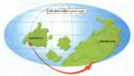 Почти невозможно представить себе, что Техас, его земля когда-то смыкалась с землей Аргентины. Однако ученые, специалисты по перемещению тектонических плит, доказывают, что это так. Старый североамериканский материк Лаврентия четыреста—пятьсот с лишним миллионов лет назад претерпел разлом (рифт и сейчас существует в Техасе), и отделившаяся часть дрейфовала в океане (это показано на карте красной дугой), пока не присоединилась к суперматерику Гондване, куда входили все известные остальные материки. Ею и была нынешняя Аргентина.
