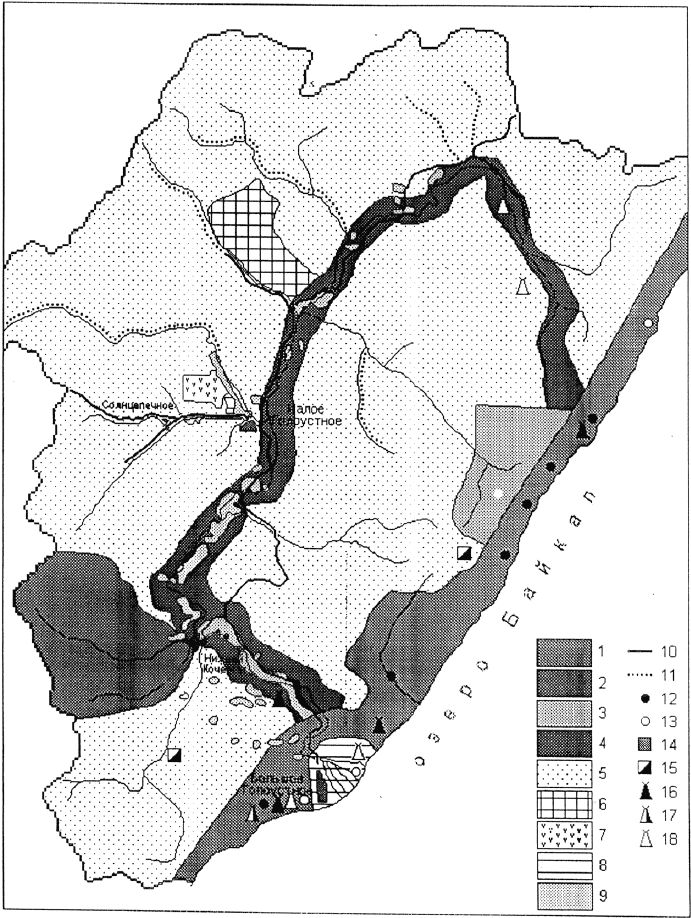 Лесные территории: 1 – Прибайкальский государственный природный национальный парк; 2 – Кочергатский государственный соболиный заказник областного значения; 3 – орехопромысловая зона; 4 – запретные нерестовые и водоохранные полосы по берегам реки Голоустной; 5 – побочное лесопользование; 6 – мараловодческое хозяйство. Сельскохозяйственные территории: 7 – подсобное хозяйство лесхоза; 8 – пастбища; 9 – сенокосы. Дороги: 10 – государственная дорога IV категории местного значения и ведомственные магистральные лесовозные профилированные дороги; 11 – магистральные автозимники. Отдельные объекты природы и культуры: 12 – памятники природы и интересные места; 13 – памятники истории и культуры. Населенные пункты: 14 – поселки городского и сельского типов; 15 – базы учебного охотничьего хозяйства Иркутского сельскохозяйственного института; Туристические базы и приюты сезонного действия:16 – действующие; 17 – проектируемые; 18 – неконтролируемые кемпинговые площадки.