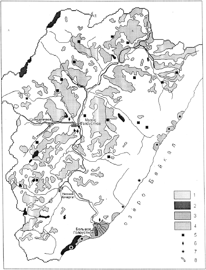 Рис. 4. Антропогенная нарушенность территории, Б. Голоустное. 1 – сплошные концентрированные вырубки; 2 – гари; 3 – деградация почв и растительных сообществ под воздействием перевыпаса; 4 – деградация почв и растительных сообществ под воздействием нерегулируемой рекреации; 5 – места бывших и существующих промышленных площадок по переработке древесины; 6 – свалки бытовых отходов; 7 – участки почвенного покрова, существенно поврежденные в местах стоянок туристов; 8 – карьеры.