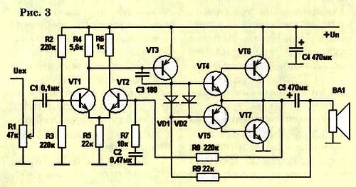 Следующий каскад на транзисторе VT3 — обычный усилитель напряжения, работу которого мы уже рассматривали в предыдущем номере журнала. Использована «вольтодобавка» — резистор нагрузки R9 подключен к «горячему» выводу громкоговорителя — и ограничение диапазона усиливаемых частот сверху конденсатором СЗ. Он также способствует устранению самовозбуждения. Для создания начального смещения на базах выходного каскада служит цепочка диодов VD1, VD2. Она нуждается в подборе: увеличивая число параллельно включенных диодов, мы уменьшаем начальный ток выходного каскада, но увеличиваем искажения типа «ступенька». Если нет осциллографа, то проконтролировать их трудно. Тогда следует просто установить начальный ток усилителя в отсутствие сигнала в пределах 10…40 мА. В ряде случаев достаточно одного диода, а иногда, если начальный ток мал, два диода приходится включать последовательно.