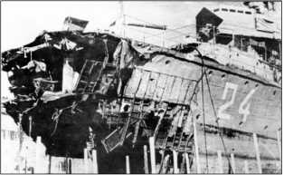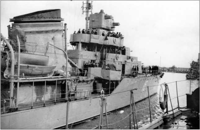 Особенно много неприятностей причинила 500-кг бомба, угодившая в железнодорожный путь, проходивший по пирсу у самого борта. Палубу полубака засыпало метровым слоем земли и щебня, а искореженные рельсы зацепились за нос корабля и прижали его к пирсу. От сильного сотрясения вышли из строя компасы и все электронавигационные приборы.
