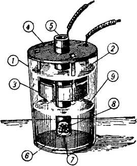 Рис. 3. Гальванический элемент и его части: 1 — стеклянный сосуд; 2 — электролит; 3 — угольный электрод; 4 — цинковый электрод; 5 — агломерат; 6 — изоляционные прокладки; 7 — крышка; 8 и 9 — провода.