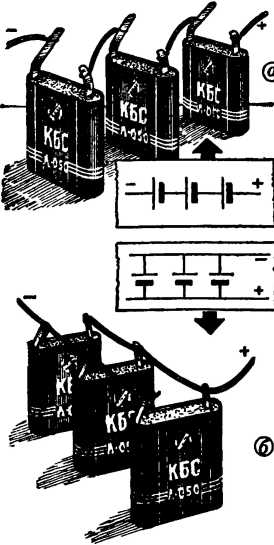 Рис. 5. Схемы соединения источников тока: а — последовательное; б — параллельное.