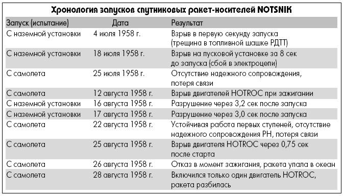 В июле 1958 г. были выполнены три попытки запуска спутника NOTSNIK, еще три — в августе. Пять из шести стартов потерпели неудачу из-за различных отказов РН. Исключение составлял запуск 22 августа 1958 г., когда ракета, запущенная с самолета-носителя вблизи побережья Калифорнии, отработала штатно. Оператор наземной станции сопровождения в Крайстчерче, Новая Зеландия, принял «странные слабые сигналы» и сообщил в Центр. Что это было? Успех? Фантом? Мы никогда не узнаем, поскольку новых сигналов не появилось…