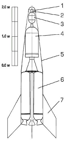 Схема ракеты-носителя NOTSNIK: 1 — спутник; 2 — РДТТ шестой ступени; 3 — РДТТ пятой ступени; 4 — РДТТ четвертой ступени; 5 — обтекатель; 6 — РДТТ второй/третьей ступеней; 7 — аэродинамический стабилизатор