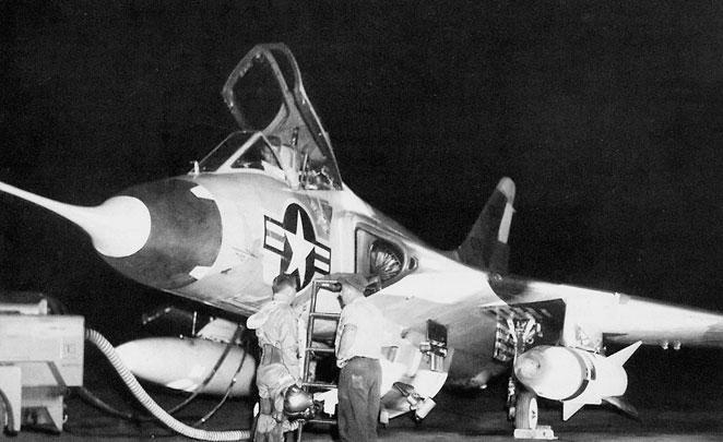 Специально оборудованный истребитель F-4D-1 Skyray осуществлял с 1958 г. пуски по проекту NOTSNIK. Запечатлена подготовка к полету с ракетой Caleb (1960 г.) (Фото W.W.West)