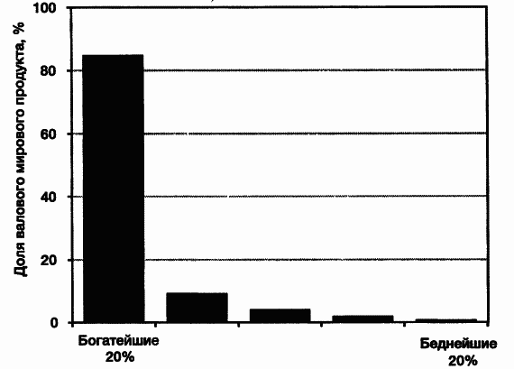 В Программе ООН по развитию содержатся данные о том, что в 1960 г. 20 % мирового населения, проживавшего в самых обеспеченных странах мира, имели доход на душу населения в 30 раз больше, чем другие 20 % населения, проживавшего в беднейших странах. К 1995 г. соотношение средних доходов 20 % богатейшего и 20 % беднейшего населения мира выросло с 30:1 до 82:1. В Бразилии беднейшая половина населения в 1960 г. получала 18 % национального дохода, а в 1995 г. — только 12 %. А 10 % богатейшего населения Бразилии получали 54 % национального дохода в 1960 г. и уже 63 % в 1995 г.[30]. Среднестатистическая африканская семья получала в 1997 г. на 20 % меньше, чем в 1972 г.[31]. Сто лет экономического роста дали миру только чудовищное неравенство в распределении доходов между богатыми и бедными. Два показателя,