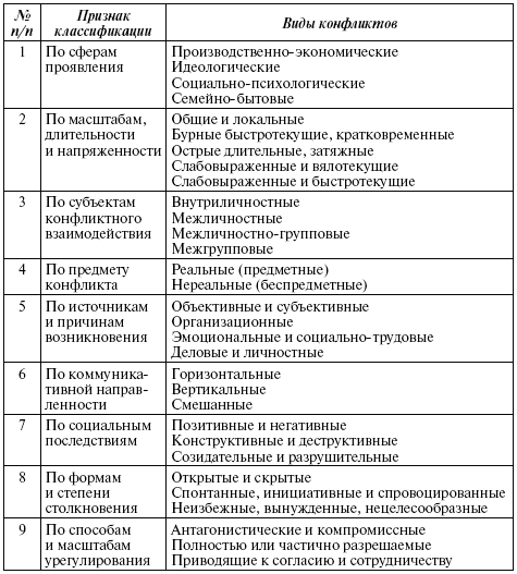 Конфликты разделяют по различным признакам в зависимости от подхода и целей анализа. Обобщенная классификация конфликтов представлена в табл. 6.1.
